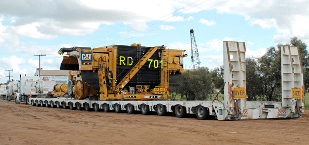 Et ci-dessous, une grosse unité de Drake Trailer, à 18 lignes d’essieux, pour le transport d’engins miniers, comme ici un châssis de dumper Caterpillar.