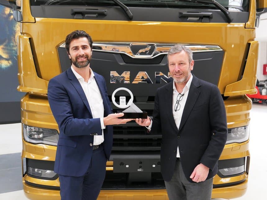 Fabien Calvet, essayeur de France Routes qui est aussi l’un des 24 journalistes européens membres du jury International truck of the year (Itoy), a remis symboliquement le trophée au DG de MAN France qui était accompagné notamment du directeur commercial Camion, Johannes Kramer.