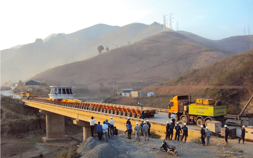 Restons en Asie du sud-est avec cet impressionnant convoi opéré par la compagnie vietnamienne Vietranstimex. En raison de restrictions de charge considérables pour franchir certains ouvrages d’art, le poids de la pièce a dû être réparti sur par moins de 56 lignes d’essieux en 2 files ! Peut-être un record dans ce type de configuration. A la base, on trouve du matériel italien, avec des éléments de remorque modulaire Cometto et des tracteurs-pousseurs Iveco EuroTrakker 8×8.