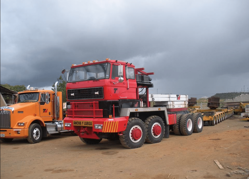 Changement de décor, avec un convoi, à vide, mais qui ne le restera pas longtemps, en Colombie. Ici, moins que la remorque Cometto, c’est le massif tracteur 8×8 qui retient l’attention. Non, ce n’est pas un Daf ! Bien que sa cabine soit celle d’un F2800. Ce tracteur a une histoire. Assez étonnante au demeurant, puisque conçu en France par René Harvey (le père des gros Willème T200, TG250, TG300…), il a été produit à quelques exemplaires et en diverses versions assemblés tantôt en France, tantôt en Espagne et exploités à l’origine par un consortium international emmené par le groupe espagnol Sainert. Vous voudriez en savoir plus ? Rendez-vous dans quelques mois dans le magazine France Routes !