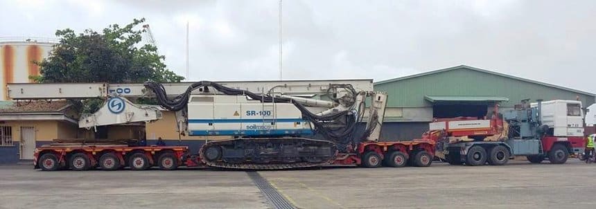 Basculons maintenant sur l’Afrique, avec un ensemble porte-engins de taille beaucoup plus modeste mais dont la composition est assez singulière qui fait appel à une semi-remorque Faymonville VarioMAX à 5 essieux et bissel intégré à 3 essieux et à un tracteur Nicolas Tractomas 6×6. Qu’un Tractomas travaille avec une remorque autre que Nicolas n’a au fond rien d’extraordinaire, c’est la preuve que ce matériel hors-normes a désormais sa vie propre dans le parc des entreprises. Celui-ci travaille pour Sarens Buildwell au Nigeria et il est chargé d’un engin de battage pour fondations spéciales, le tout affichant un PTR de 115 t. Il s’agit probablement d’un Tractomas d’occasion, peut-être du TRB 66 OZ livré en 1982 à Alraine, justement au Nigéria.