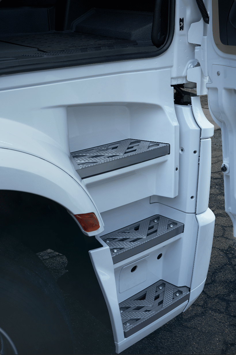 Avec l’Actros F, Mercedes introduit un nouveau type de cabine dans son portfolio. Cette nouvelle variante des cabines StreamSpace et BigSpace de 2,5 mètres de large avec un tunnel moteur de 120 mm offre une excellente habitabilité pour sa catégorie et permet au chauffeur un accès aisé avec sa hauteur plus faible et ses trois marches.
