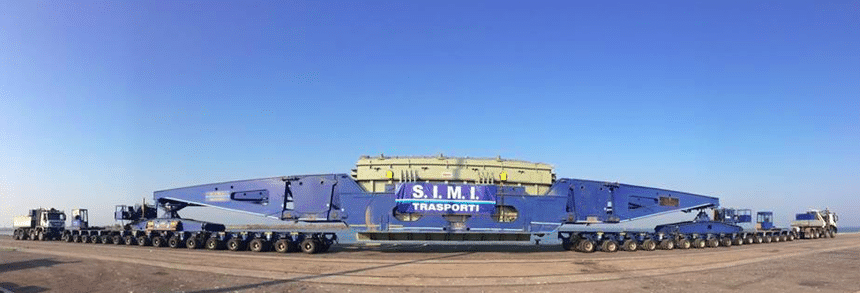 Autre exemple de la souplesse d’adaptation dont sont capables ces matériels, avec cette autre remorque modulaire Nicolas, également exploitée en Italie, mais par la compagnie SIMI. On la voit d’abord configurée en remorque de 16 lignes, puis en deux fois 16 lignes avec poutres, chargée alors d’un transformateur de 345 t. Dans les deux cas la mobilité est assurée par des tracteurs-pousseurs Iveco Trakker 8×8.