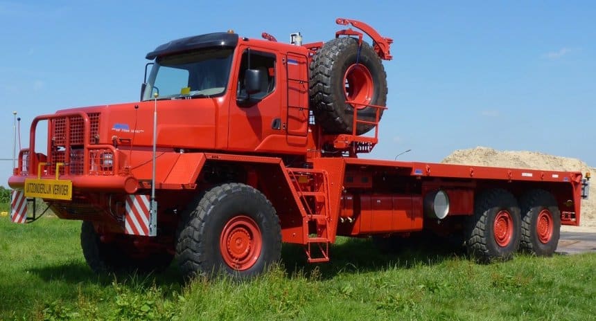 C’est le plus petit des tracteurs lourds Mol, ce qui donne une idée des gammes que pratique le constructeur. Ce tracteur lesté HF5066 est aussi le plus récent qui soit sorti des usines belges qui renouent à cette occasion avec les véhicules pour transports exceptionnels routiers – les précédentes commandes, de l’Algérie et de la Tunisie, concernaient des modèles pétroliers off-road.