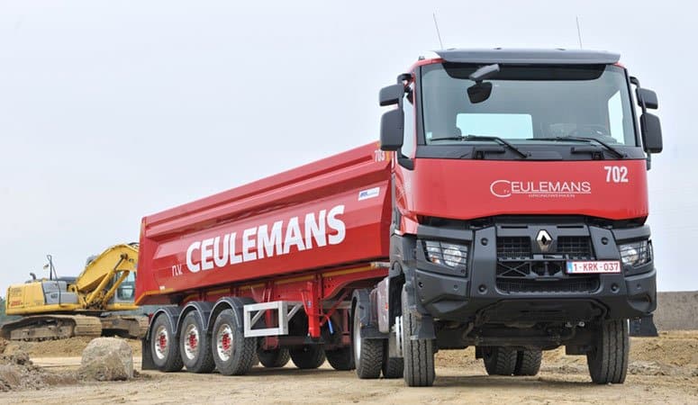 Mol est aussi l’un des plus importants fabricants belges de remorques et semi-remorques, comme cette semi benne exploitée par Ceulemans avec un tracteur 4×4 Renault K430.