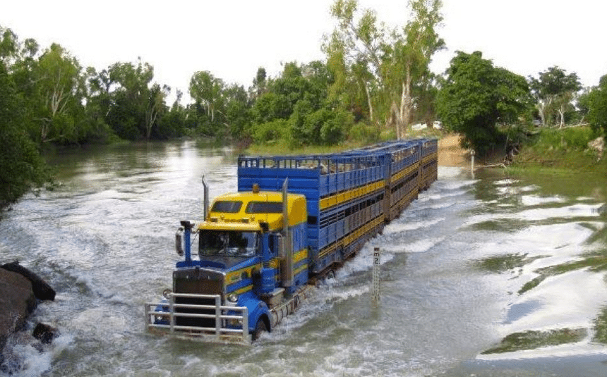 Ce robuste Kenworth australien, avec ses deux ponts moteurs, ne devrait pas avoir trop de mal à franchir ce gué impressionnant mais encore très carrossable, du moins en cette saison.