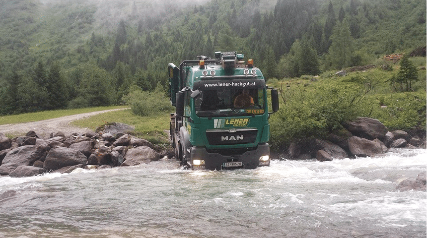Plus aventureux, ce MAN autrichien s’avance prudemment pour traverser ce torrent de montagne. Mais s’agissant d’un 6×6, l’affaire ne devrait pas trop mal se passer.