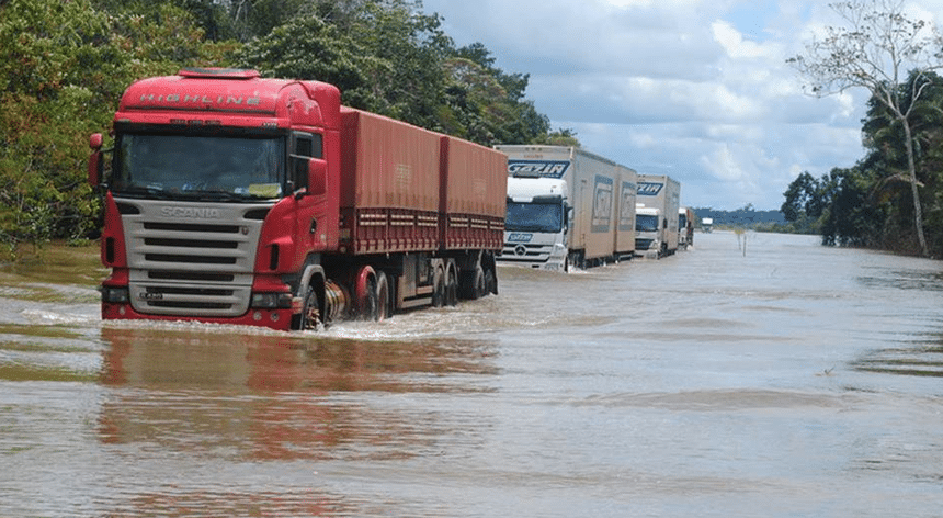Situation plus compliquée pour ces B-trains brésiliens qui doivent se frayer un chemin sur une route inondée par des pluies diluviennes et fréquentes dans la région.