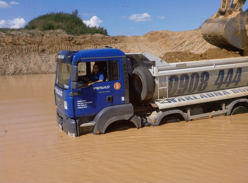 Cette carrière de Slovaquie est devenue une belle retenue d’eau mais le travail continue. Prévoyante, l’entreprise n’engage ici que des camions à forte motricité, comme ce MAN TGA 8×8.