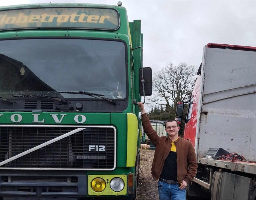 Lors de notre rencontre, Niels Simard prenait la route en direction de Dortmund en Allemagne, au volant d’un Volvo FH5 de 2024. À 22 ans, il est déjà propriétaire d’un camion ancien, un Volvo F12 Globetrotter de 1984.