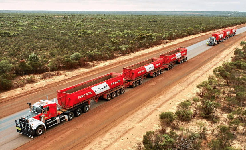 Compagnie minière. En Australie, la compagnie minière Mineral Ressources teste actuellement un convoi composé de trois road trains de 300 t de charge utile roulant en formation, avec un seul conducteur dans le tracteur de tête. Chaque road train est composé d’un tracteur et de trois remorques. Précision importante, ces ensembles évoluent exclusivement sur une route privée.