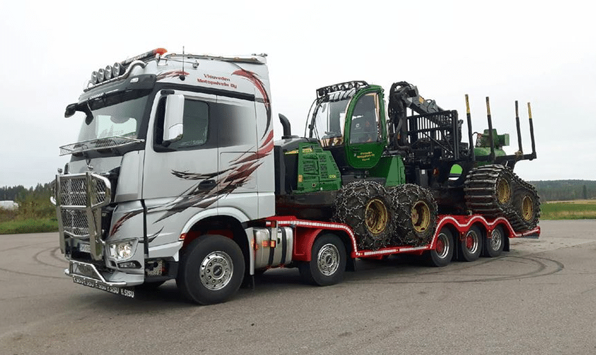 Autre façon de procéder, très prisée en Finlande, mais aussi dans toute la Scandinavie, celle qui consiste à utiliser un porteur lourd carrossé en porte-engins et dont le plateau épouse la forme des longerons du châssis, de manière à abaisser les passages de roues dans l’empattement. Ce qui réduit d’autant la hauteur du convoi et accessoirement le centre de gravité. Une solution très pratiquée pour le transport d’engins forestiers mais qui suppose des opérations régulières car ce type de camion, hautement spécialisé, ne brille évidemment pas par sa polyvalence.