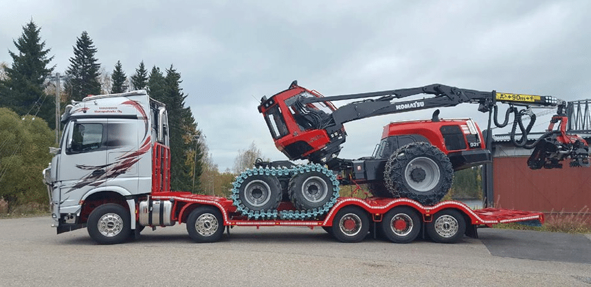 Il est partout nécessaire d’acheminer des engins, qu’ils soient de construction, de manutention, d’exploitation agricole ou forestière, mais on ne procède pas partout de la même manière. Question de réglementation, d’habitudes aussi, de moyens parfois. Voici deux exemples, découverts en Finlande, qui changent un peu de ce que l’on connaît en France.