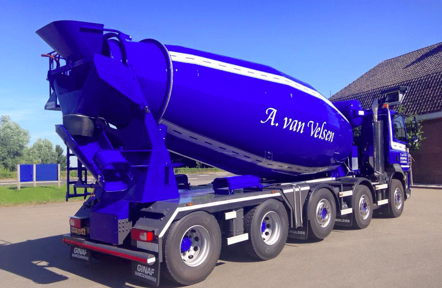 Reste qu’un client, A. van Velsen Transport, de Stompwijk, a demandé tout autre chose à Ginaf : de lui fabriquer un porteur à 5 essieux le plus léger possible, mais capable de rouler à 50 t (limite de PTAC légale aux Pays-Bas). But de la manœuvre, embarquer 14 m3 de béton, sans risquer d’être en surcharge.