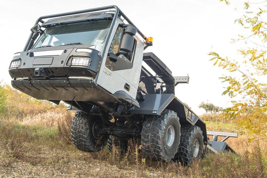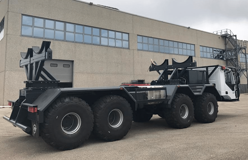 Mais ici, la problématique est différente. Ces châssis Astra, modifiés par Tekne (qui travaille aussi sur des bases Iveco Trakker) sont des 8×8. Donc des camions appelés à circuler sur des sols non revêtus, voire en mauvais terrain. En fait, si leur cabine a été déplacée devant le moteur ce n’est pas pour en faciliter l’accès, mais pour permettre au chargement de passer au-dessus du pavillon. En l’occurrence, il s’agit ici de transporter des tubes de pipe-line. Ces pièces relativement longues peuvent ainsi être acheminées à l’aide d’un véhicule compact, donc maniable, sans trop dépasser de son gabarit, ce qui est un avantage sur certains chantiers.