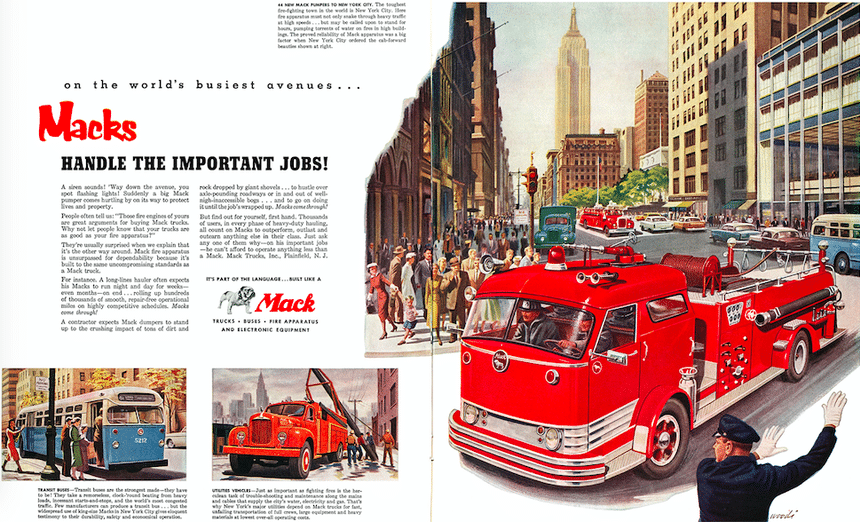 Deux ans plus tard, en 1957, la même thématique se retrouve dans une publicité parue à l’occasion de la livraison, à la ville de New York, de 44 nouveaux camions de pompiers.