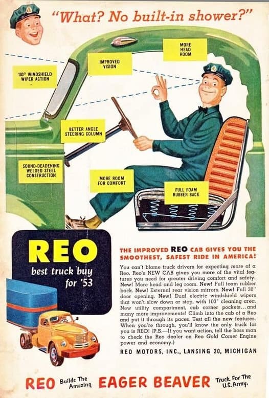 Tout est dit dans l’accroche. Un conducteur goguenard, mais ravi de son nouveau poste de travail, ironise : « quoi ? Il n’y a pas de douche intégrée ? ». Et le constructeur – en l’occurrence Reo – d’enchaîner: « on ne peut pas lui reprocher d’en attendre plus d’un Reo ».