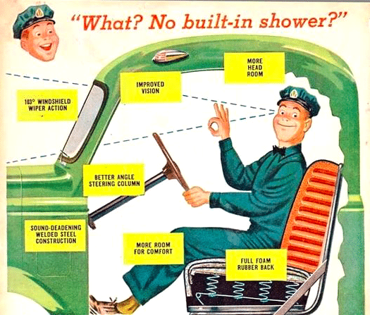 Tout est dit dans l’accroche. Un conducteur goguenard, mais ravi de son nouveau poste de travail, ironise : « quoi ? Il n’y a pas de douche intégrée ? ». Et le constructeur – en l’occurrence Reo – d’enchaîner: « on ne peut pas lui reprocher d’en attendre plus d’un Reo ».