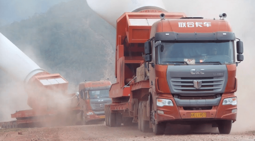 Un aperçu de la gamme C&C et deux tracteurs 6×4 au travail, acheminant de grandes pales d’éolienne quelque part en Chine.