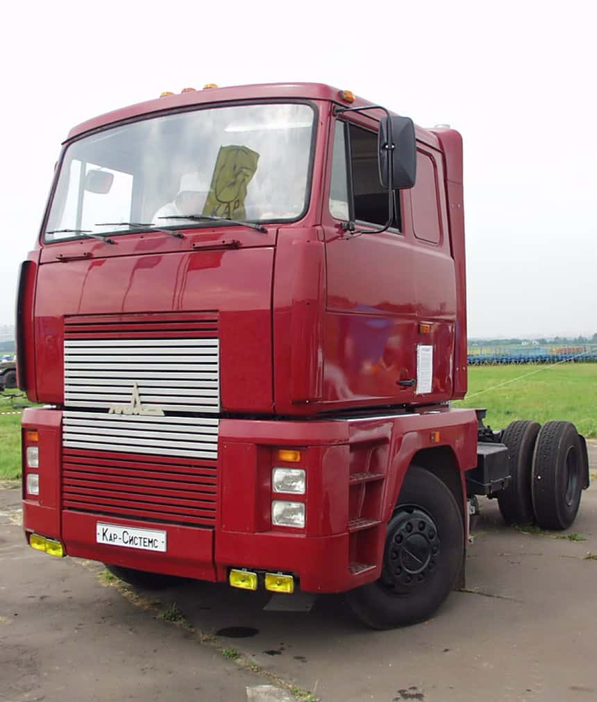 Dans le premier exemple, celui du Maz 5445, la source d’inspiration française est évidente. Jusqu’à la calandre, pourtant peu réussie sur la version initiale de l’AE, qui est presque semblable à celle du Renault. Reste que la cabine est plus haute, avec un pavillon fortement rehaussé, faisant ainsi office de déflecteur, et surtout que l’emmarchement est placé en avant (et non en arrière) des roues directrices, elles-mêmes très classiquement reculées. Sans doute parce que la base roulante était reprise, telle quelle, d’un modèle existant. Ce tracteur à plancher plat fut dévoilé en 1993, c’est-à-dire trois ans après la sortie du Renault AE.