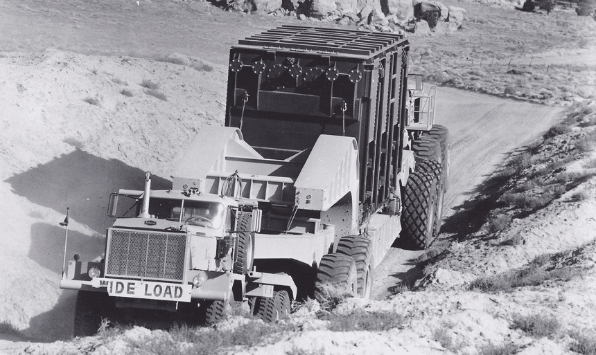 Ces images, tirées des (riches) archives photographiques de la marque américaine Autocar, ne sont malheureusement pas accompagnées de commentaires (ou ne le sont plus). L’histoire se situe à l’aube des années 60 et l’on sait seulement que le tracteur engagé dans cette mission est un modèle AP 19, gros 6×4 hors code, motorisé par un diesel de 430 ch et associé à une boîte à convertisseur de couple à 6 rapports. Le poids du transfo n’est pas connu. La semi surbaissée, quant à elle, paraît bien adaptée au roulage off-road avec des pneus « sable » de grande dimension (contrastant avec les 14.00×24 du tracteur) et une reprise de charge sur l’avant confiée à un dolly à essieux tandem.