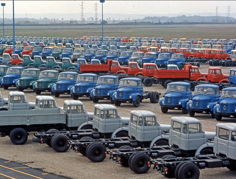 Outre des licences de fabrication, Berliet ne livrera pas moins de 11 290 véhicules complets à la Chine entre 1958 et 1976. Essentiellement des modèles lourds et spéciaux, comme on en voit ici, sur le parc de l’usine, en attente d’expédition, en 1967.