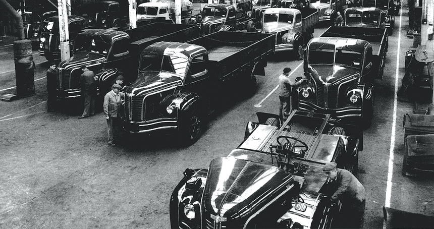 Avec, en ouverture, le hall de finition de Vénissieux en 1955 qui laisse apparaître une belle brochette de GLR, alors modèle phare de Berliet. Un camion particulièrement réussi qui connaître une carrière longue et exemplaire, en France comme à la grande exportation. Le châssis au premier plan est dépourvu de cabine car il est destiné à être habillé par un carrossier extérieur en fourgon intégral, comme cela se pratiquait encore couramment à l’époque.