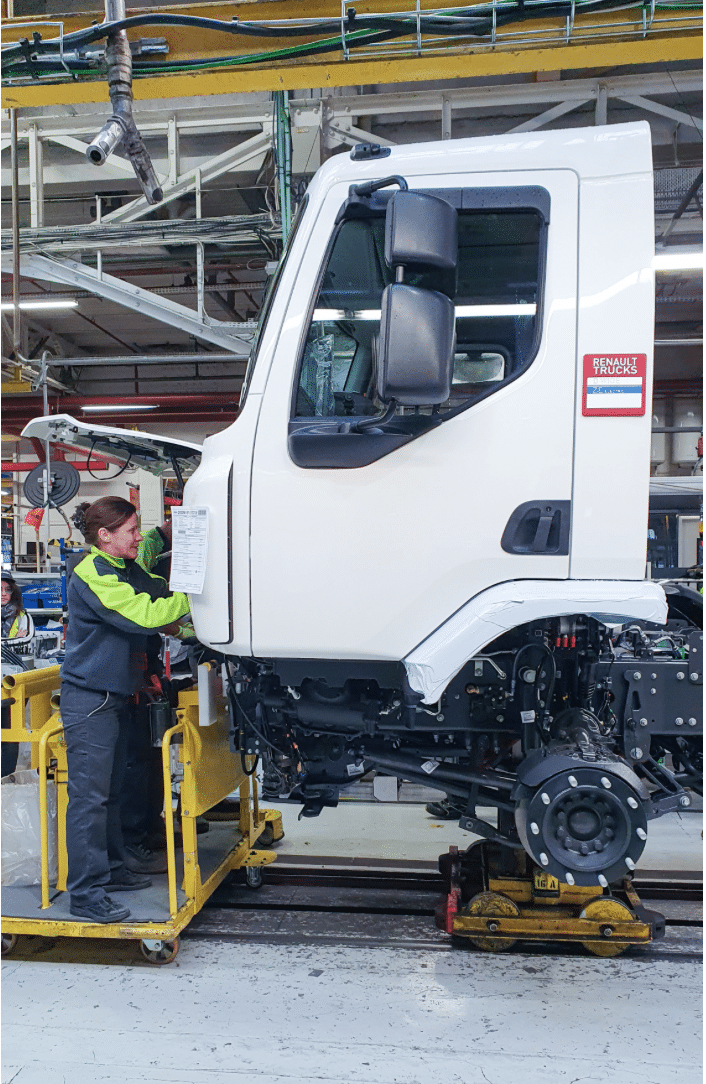 La fabrication des camions électriques débute une semaine avant leur passage sur la ligne avec des premières opérations qui sont réalisées dans l’enceinte du bâtiment Z.E. Différents sous-ensembles propres à un véhicule 100 % électriques (propulsion, moteur, boîte de vitesses, unité centrale…) sont assemblés par des techniciens habilités. Ils sont ensuite acheminés en bord de ligne d’assemblage afin d’être montés sur le véhicule.