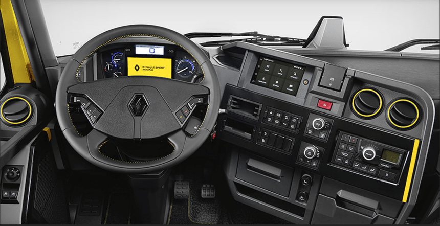 Côté moteur, ce T High RS avance grâce à un 6 cylindres de 13 litres (DTI 13)d’une puissance de 520 ch et qui développe un couple maximum de 2 550 Nm. Celui-ci est accompagné de la boîte de vitesses robotisée « maison » Optidriver.