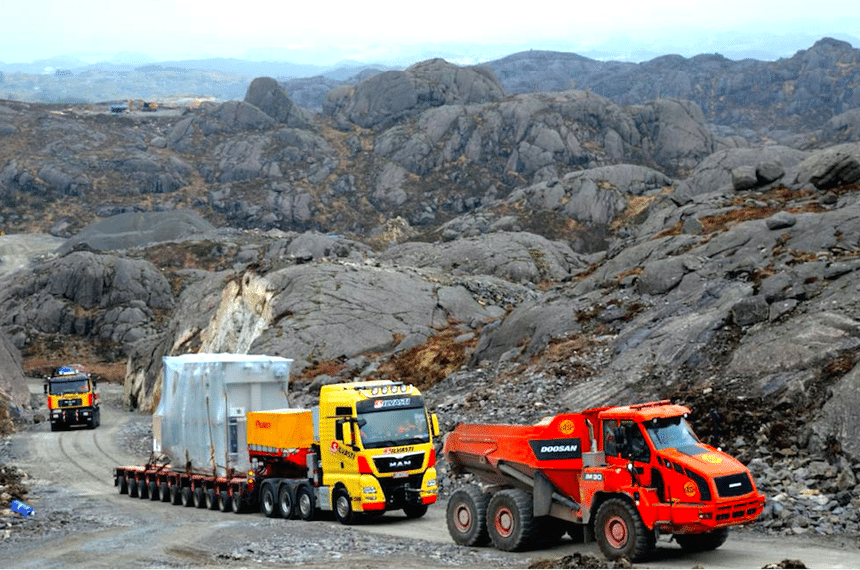 Une bonne partie de la Norvège est constituée de terres sauvages et indomptées qui en font le charme mais imposent aussi certaines difficultés aux communications routières. Surtout avec un convoi de 165 t.