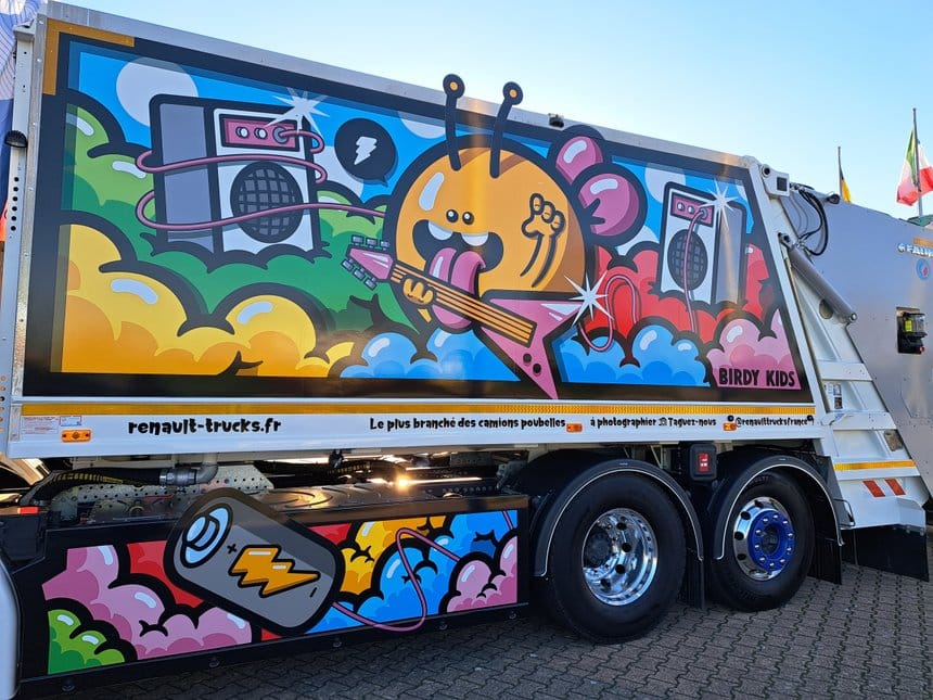 Il a donc récidivé sur cette BOM, présentant cette drôle d’abeille qui joue de la guitare forcément électrique. L’ensemble est un covering géant qui occupe les flancs de la benne Faun. De quoi amuser les passants quand le camion travaille en ville, dans le silence de la motorisation électrique.