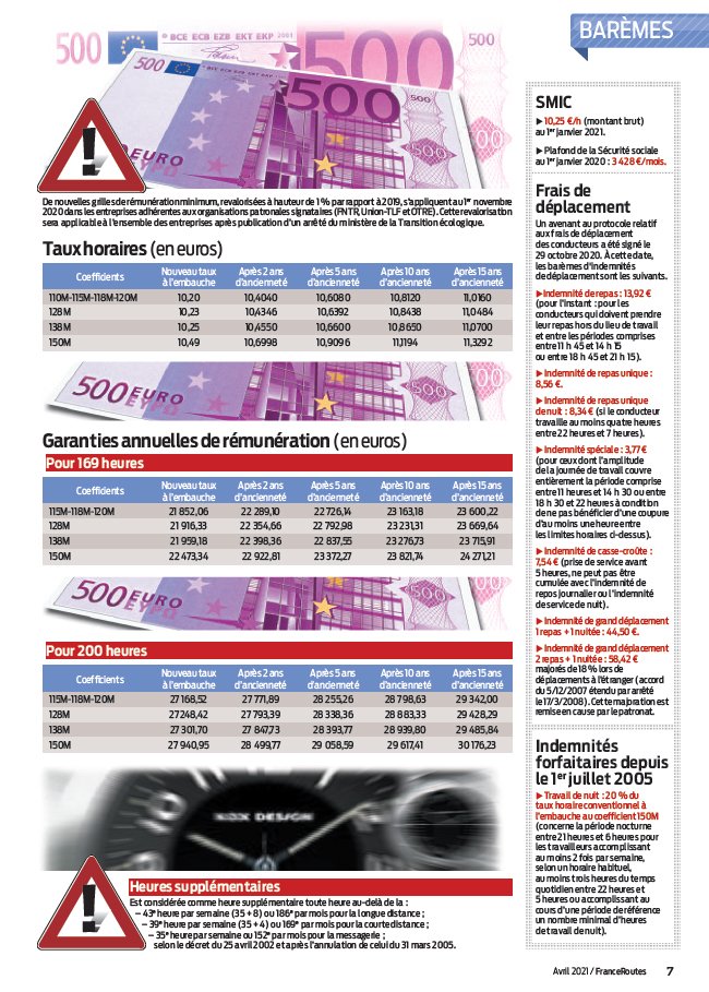 Pour connaître les barèmes de salaires revalorisés pour les conducteurs routiers, consultez le magazine FranceRoutes qui les publie chaque mois.