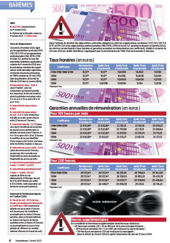 Chaque mois dans sa rubrique Barèmes, France Routes publie les grilles des salaires conventionnels dans le TRM, mais aussi les indemnités conventionnelles pour les frais de déplacement. Pour les consulter, abonnez-vous en cliquant sur ce lien.