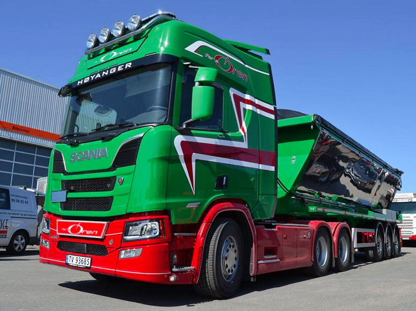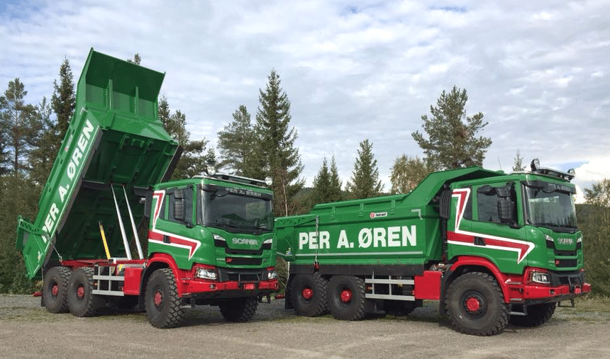 Mais avec un peu de goût pour les belles choses et un sens affûté de la communication on peut aussi donner à ces « Scania terrassiers » un look éclatant. C’est ce que n’a pas hésité à faire le transporteur norvégien Per A. Øren qui a appliqué aux siens la même livrée qu’à ses camions routiers.