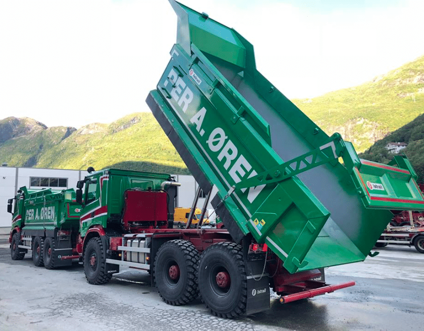 Avec leurs pneus de grande dimension, montés en simple en l’arrière, les Scania 6×6 de Per A. Øren sont particulièrement impressionnants. Leur benne de 16 m3 a été fournie par le carrossier norvégien Istrail.