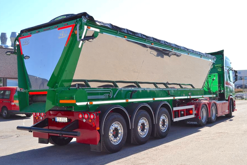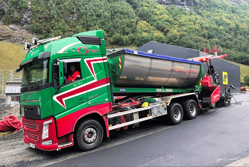 Enfin, pour revenir à Per A. Øren, voici une autre de ses récentes acquisitions, routière cette fois. Il s’agit d’une semi-remorque à enrobés construite localement par Nor-Slep. La benne est en acier à haute résistance, elle convient donc également pour du sable ou des concassés. Elle est naturellement isolée et revêtue de tôles en acier inoxydable polies. Efficace et superbe. Et pour l’emmener, bien évidemment, un tracteur Scania !