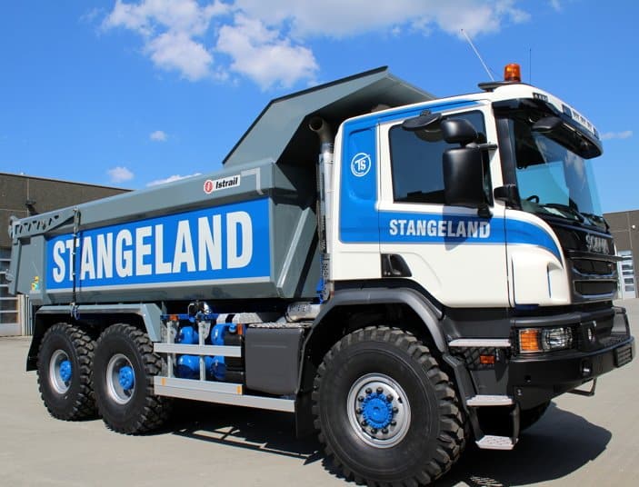 Cependant, ces camions ne sont pas les premiers du genre réalisés par Scania. Ils sont en effet l’exacte réplique, mais dans la nouvelle génération Euro 6, des P450 6×6 développés, il y a quelques années, pour un autre entrepreneur norvégien, Olav Stangeland. Celui-ci en exploite dix exemplaires qui se distinguent aussi par leurs 6 roues motrices (à monte simple arrière), leur châssis renforcé et leur boîte automatique à convertisseur. Leur charge utile est en revanche un peu moindre, avec « seulement » 25 t en chantier fermé (sur route, au PTAC légal, elle ne serait que de 10 t).
