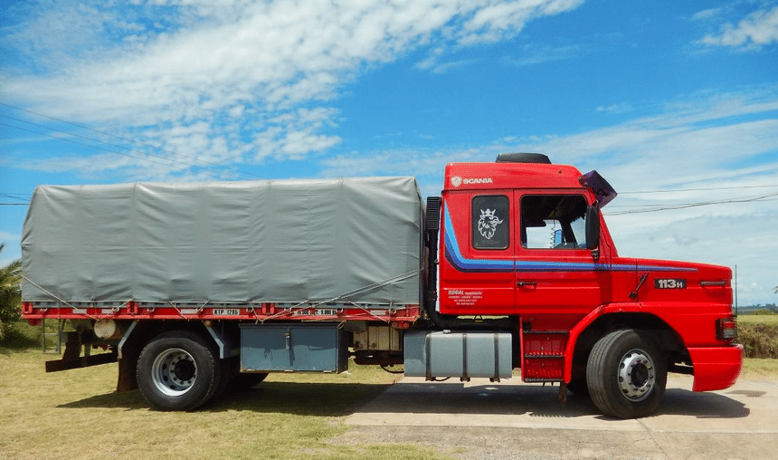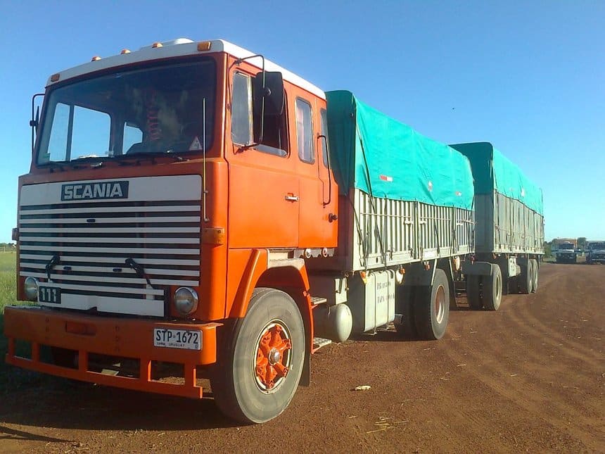 On le croirait neuf, mais il a vingt-trois ans de route dans les roues. Et pas sur les itinéraires les plus faciles : ce Scania T113H travaille en Uruguay où sa carrière est loin d’être finie. Ce genre de porteur 4×2, d’empattement court et carrossé d’un simple plateau-ridelles bâché, est ici tout à fait habituel en longue distance. Bien évidemment, un tel camion n’est pas fait pour rouler en solo et bien qu’il soit ici dételé il lui est généralement associé une remorque Randon à 2 essieux, d’origine brésilienne.