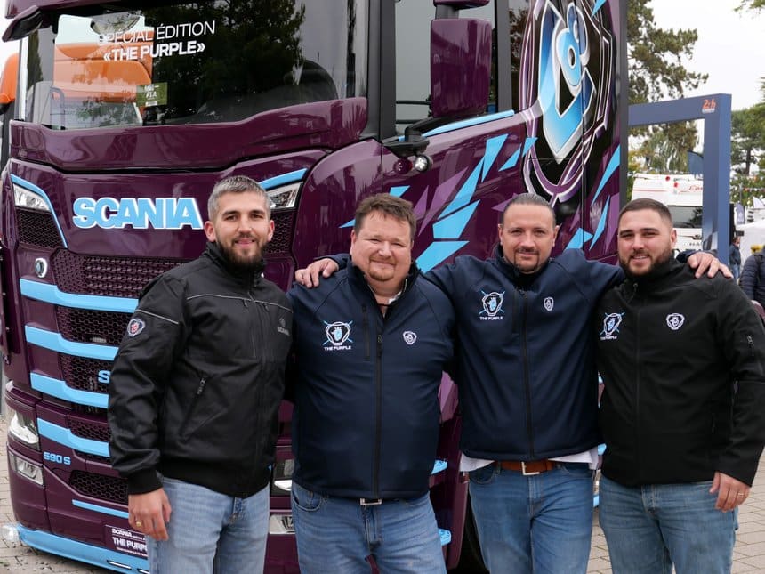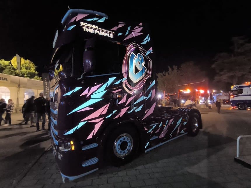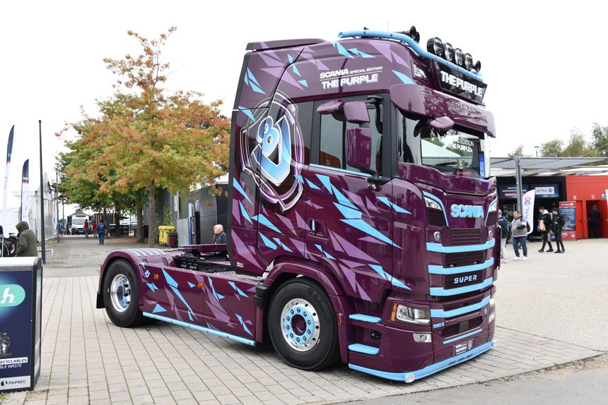 Mélange détonnant. Côté esthétique, le mélange détonne presque autant que le moteur à huit cylindres : peinture de base Scania purple (violet), éclats violet et bleu ciel éparpillés sur la carrosserie, avec les lignes de calandre peints à l’identique, et ce gros logo V8 de chaque côté, histoire de rappeler s’il en était besoin que non, le roi des moteurs thermiques n’est pas mort !