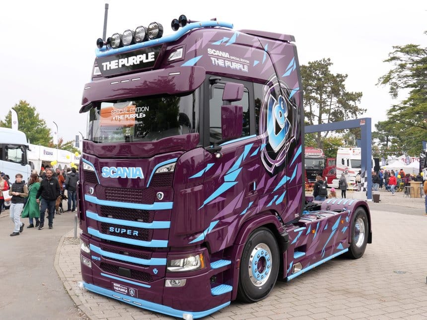 Mélange détonnant. Côté esthétique, le mélange détonne presque autant que le moteur à huit cylindres : peinture de base Scania purple (violet), éclats violet et bleu ciel éparpillés sur la carrosserie, avec les lignes de calandre peints à l’identique, et ce gros logo V8 de chaque côté, histoire de rappeler s’il en était besoin que non, le roi des moteurs thermiques n’est pas mort !