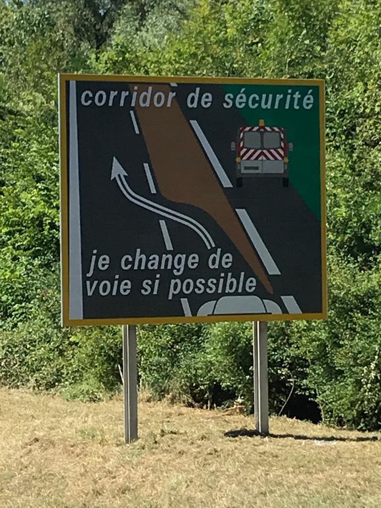 Les sociétés d’autoroutes commencent à installer des panneaux d’indication destinés à sensibiliser les conducteurs à la pratique du corridor de sécurité. Il n’est jamais trop tard.