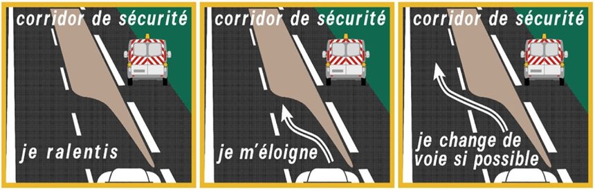 Les conducteurs doivent changer de voie de façon à en laisser une de libre entre les intervenants et leurs véhicules roulants, ou bien se décaler le plus possible à gauche de leur voie et ralentir très significativement, notamment hors voie rapide et autoroute. « Il faut que les sanctions prévues du non-respect des distances de sécurité et du respect du corridor de sécurité soient appliquées, revendique Luc le Baron. La sanction fait parler et de, par là même, représente une pédagogie répressive indispensable ».