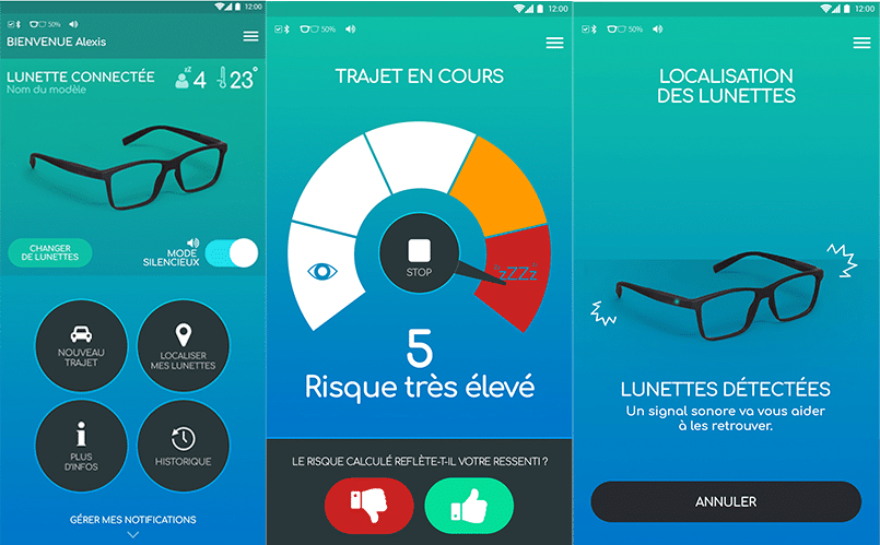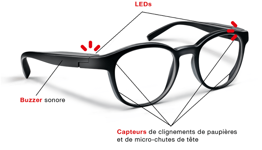 La monture intelligente aide à prévenir l’endormissement au volant grâce à des micro-capteurs repérant des signes précurseurs comme les bâillements ou le clignement des paupières qui s’accélère. Associées à une application mobile, ces lunettes alertent le conducteur par un signal lumineux ou un son. Celui-ci peut également recevoir une notification sur son smartphone, tout comme les passagers s’ils ont été enregistrés en amont dans l’application.