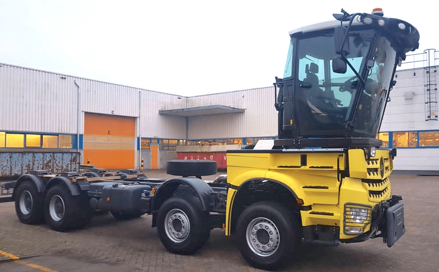 Tel qu’on le voit, cet Arocs transformé n’est pas encore carrossé, mais ça ne saurait tarder puisqu’il est ici devant les ateliers de Wilmers Kommunaltechnik, une entreprise réputée pour ses équipements de débroussaillage et de broyage. A suivre donc…