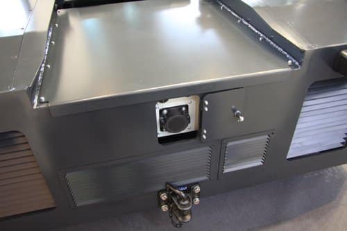 Ce tracteur dispose de deux batteries lithium-ion interchangeables d’une puissance de 61 kWh, qui offrent une amplitude d’utilisation de 9 à 11 heures avec 8 heures d’utilisation constante. Cette prise à l’arrière du véhicule permet de « biberonner » : branchée pendant 30 minutes, elle permet de recharger la batterie de 15 %.
