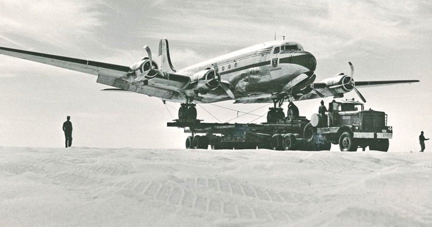 Les trois premiers amenèrent des grues, afin de soulever l’infortuné DC-4, le quatrième tractant l’appareil sur une semi-remorque spécialement aménagée. Coup de chance, une piste praticable n’était pas trop éloignée. Il y avait tout de même 5 km de sable à parcourir, avec un chargement fragile et pour le moins instable. Mais l’opération réussit. Elle est restée depuis dans les annales de l’aviation commerciale.