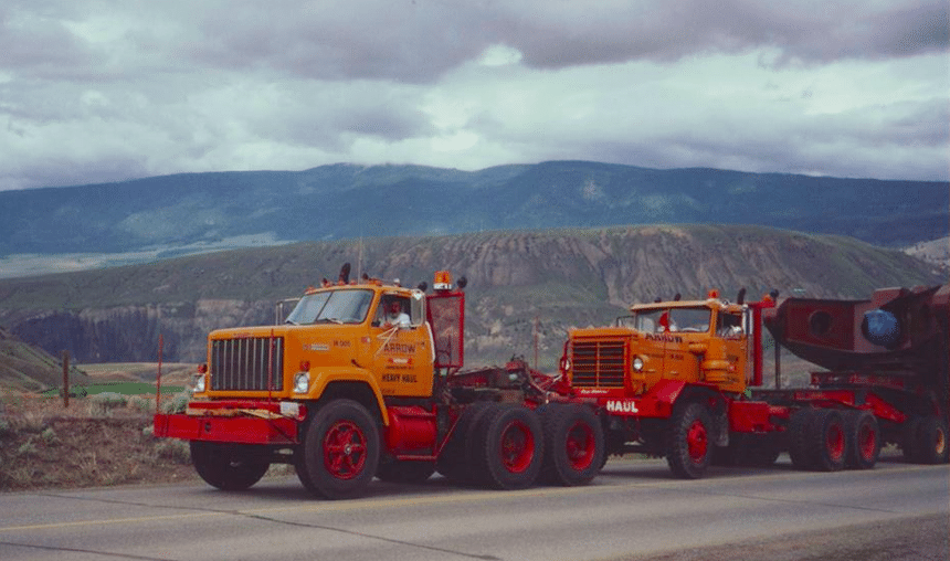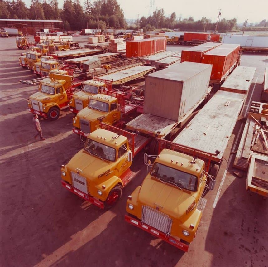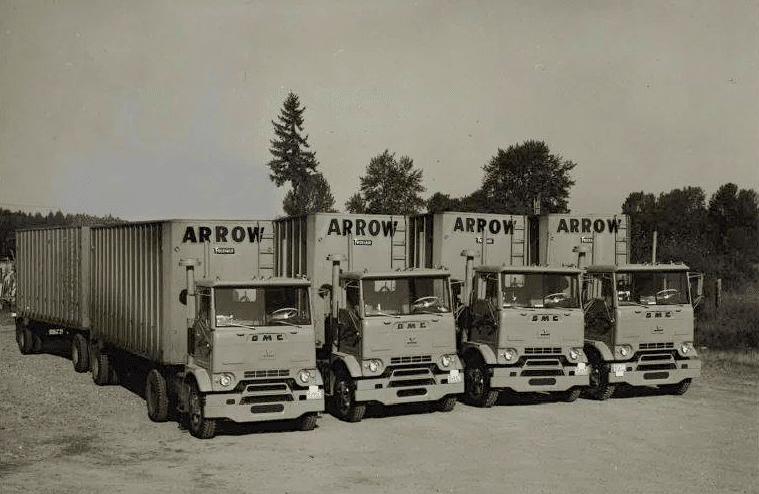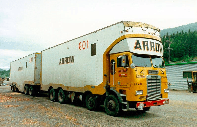 Plus anciens, car datant des années 60, ces quatre GMC Crackerbox 4×2 tirent des trains doubles carrossés par Fruehauf en fourgon messagerie. Une configuration à 5 essieux plus souvent pratiquée aux États-Unis qu’au Canada, mais Arrow desservait (et dessert toujours) les USA.