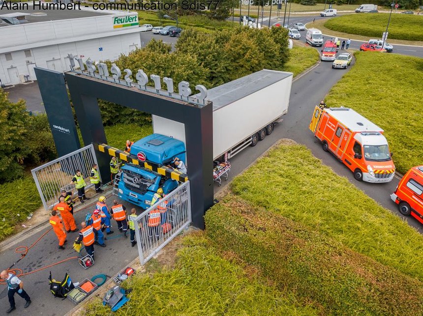L’image est impressionnante : le 20 août, ce camion est venu s’encastrer dans un portique d’accès à un parking du Carré Sénart, centre commercial de Lieusaint (Seine-et-Marne).