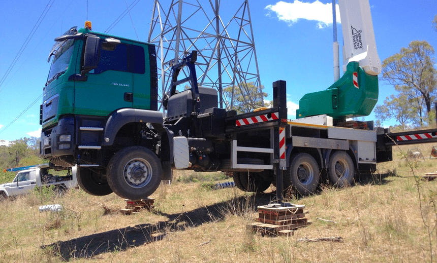La preuve avec cette nacelle élévatrice (une Bronto Skylift montée sur un châssis MAN TGS 6×6) appelée à intervenir au pied d’un pylône ancré sur un terrain en forte déclivité. Mise en œuvre par la compagnie australienne Vertical Tower Hire, son calage en tient compte de manière spectaculaire. Car sans une parfaite horizontalité du porteur, la nacelle ne peut être déployée. Or, celle-ci opère tout de même jusqu’à 46 m de hauteur, avec une capacité de 600 kg. Évidemment, ceux qui ont mis le camion dans cette position savent parfaitement ce qu’ils font, mais de là à dire que l’installation inspire vraiment confiance, il y a une certaine marge…