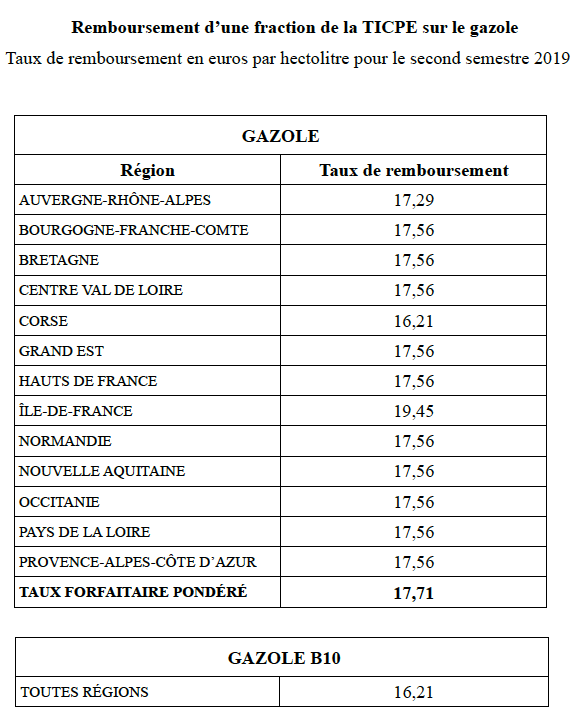 En attendant l’hypothétique rabotage de l’exonération de TICPE sur le gazole, on solde les affaires courantes. Cette circulaire présente les taux de remboursement d’une fraction de la taxe intérieure de consommation sur le gazole utilisé par les transporteurs routiers de marchandises pour le second semestre 2019.